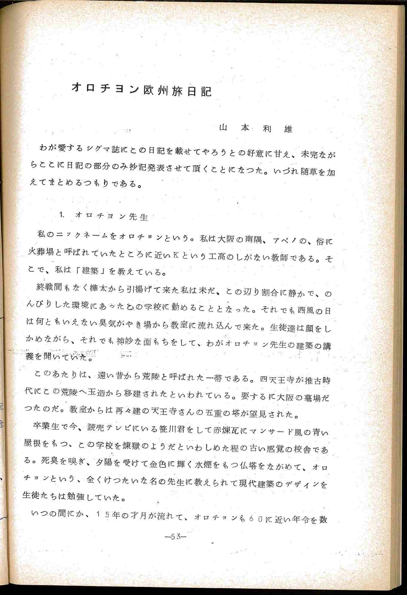初めの頃 わが建築科への志願者は少なく定員に充たない時もあった。正に悲壮であった。その時分、志願者の調整事務が行われ、私は今宮工高へ不足分をもらいに行ったことがある。先方で落ちたうち良いものを拾ってわが校へ入れる訳である。情けない思いであった。外「工芸高校てどこにあるんや」「建築科があるのか」と足を棒にして日夜 祭日も日曜も歩き疲れて市内の業界者へ飛び込んだ時の言葉がこれであった。そして内 製図板1枚、机1つもなかったのだ、いや、それどころではない、居る場所すらなかった。全部図案科の借り物で、教員も同科に食客になったり。講堂に間仕切りして過ごしたものであった。無名で伝統なく、質い於いて一歩を譲るといった当時のわが科の姿はこの様に貧弱なものであった。そのさなか、毎日毎日芋ばかり弁当にもってくる子、授業料不払い長期の子、身も心も愛情にえう、やせ細った貧弱な子等が私達にまっわりつくのだ。太陽を求め 温かいものを求めて・・・・・私達も同じくやせて貧弱さに変わりはなかった。むしろ原始的なオロチョン部落といえよう。そして「叱り」「反抗し」「論じ」・・・・・